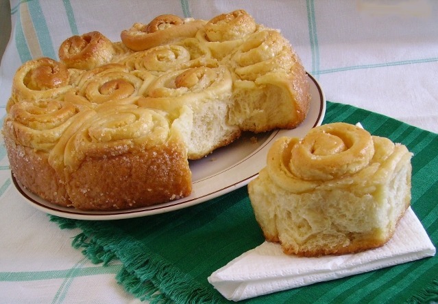 Cesto vyklopime, posypeme múkou, vyvaľkame a natreme krémom. Zrolujeme a režeme na približne 4cm rolky. Nádobu trocha natreme kremom a ukladame rolky, ktore môžme natrieť medzi sebou roztopeným maslom alebo olejom aby sa po dopečení ľahšie vyberali.