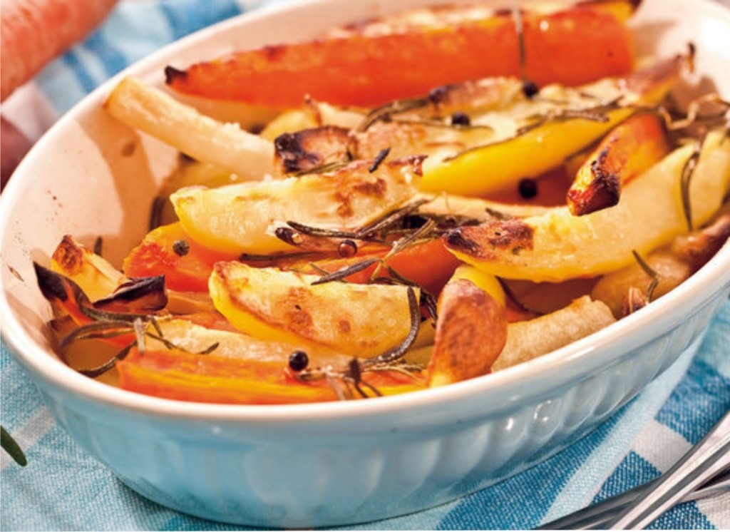 Do zapekacej misy dáme olej, zeleninu, ošúpaný cesnak a natrhaný rozmarín. Dôkladne osolíme a okoreníme. Pečieme 45 až 50 minút v rúre alebo pece vyhriatej na 200 °C. Počas pečenia zeleninu niekoľkokrát poobraciame. Podávame ako prílohu k pečenému alebo varenému mäsu.