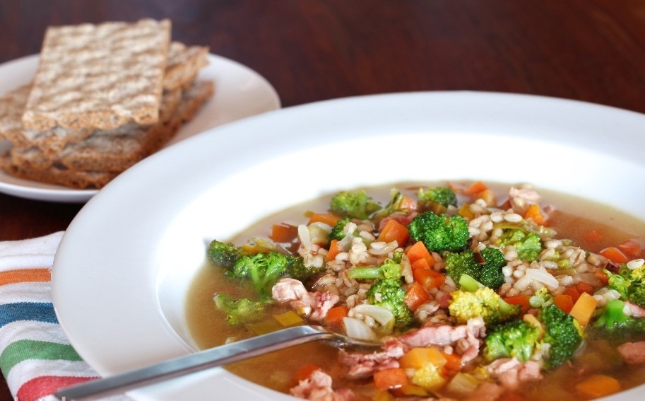 Mäso dáme variť do studenej vody, okoreníme, osolíme a po pol hodine pridáme očistenú cibuľu a pokrájanú zeleninu. Uvarené mäso vykostíme, nakrájame a vložíme späť. Nakoniec zavaríme krúpy.