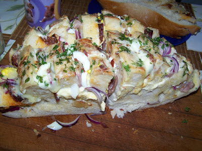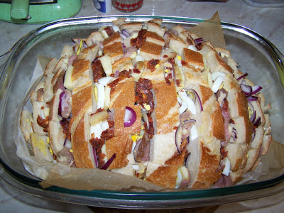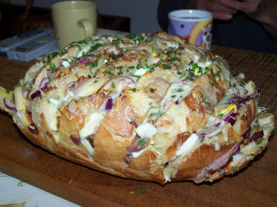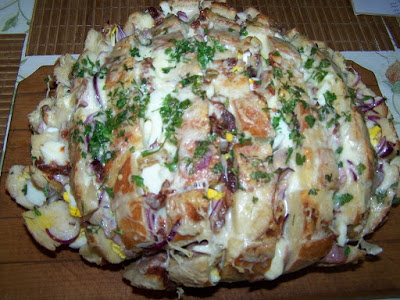 Na pôvodnom obrázku sa mi zdalo, že chlebík je plnený len syrom, syrom a syrom. Ale vzhľadom na to, že máme pár dní po sviatkoch, máme doma všelijaké fajnotky, tak som si to rozmyslel a so všeličím som naplnil chlebík.