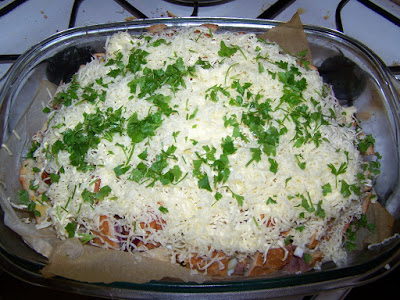 Pečieme to 20-25 minút prikryté a ďalších 15 minút odkryté a necháme vrch zapiecť, kým nie je syr zlatkastý.