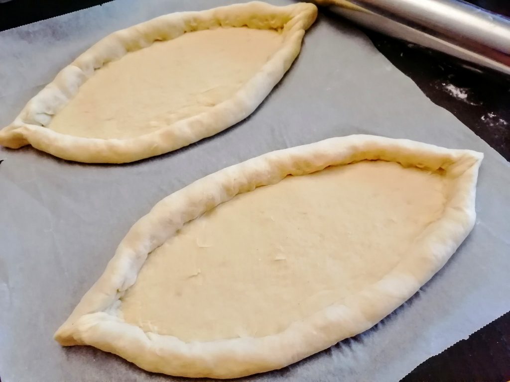 Po vykysnutí cesto rozdelíme na 4 časti, vytvarujeme do oválu. Okraje naplníme strúhaným eidamom, konce spojíme a vytvoríme „loďku”.