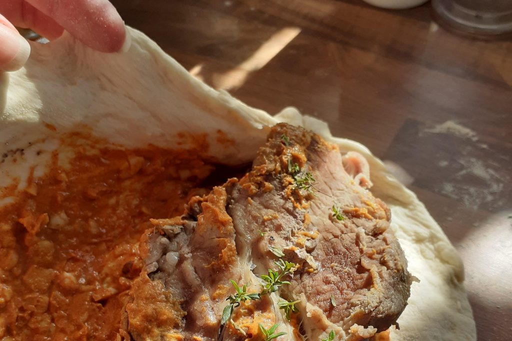 Cesto na chlieb rozrežeme na 3 rovnaké kúsky ktoré vyvaľkáme. Jednu stranu cesta potrieme pripravenou horčicovou zmesou a na každý kúsok vložíme 2 potreté kúsky krkovičky. Cestom prikryjeme krkovičku, stlačíme jeho okraje a vyformujeme do tvaru žemle.